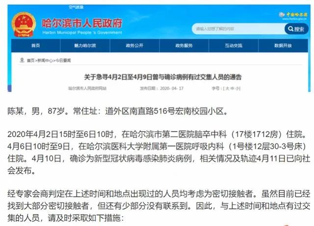 为此,4月17日哈市向社会发布了关于“急寻4月2日至4月9日曾与确诊病例有过交集人员的通告”,急寻陈某的密切接触者。通告称,虽然目前已经找到大部分密切接触者,但还有少部分没有联系到。希望在与通告的时间和地点有过交集的人员,要及时采取必要措施,主动及时进行检测。